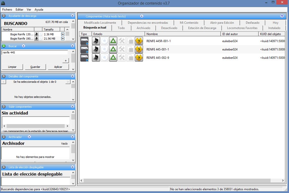 La cosa sigue igual, estoy en el content manager. Busco la locomotora que me he descargado (en este caso la 253), me voy a dependencias no encontradas y doy click derecho y descargar. Veo que se descargan y aparece el tick verde. Luego me voy a las cocheras del juego y sigue sin aparecer en la vía...