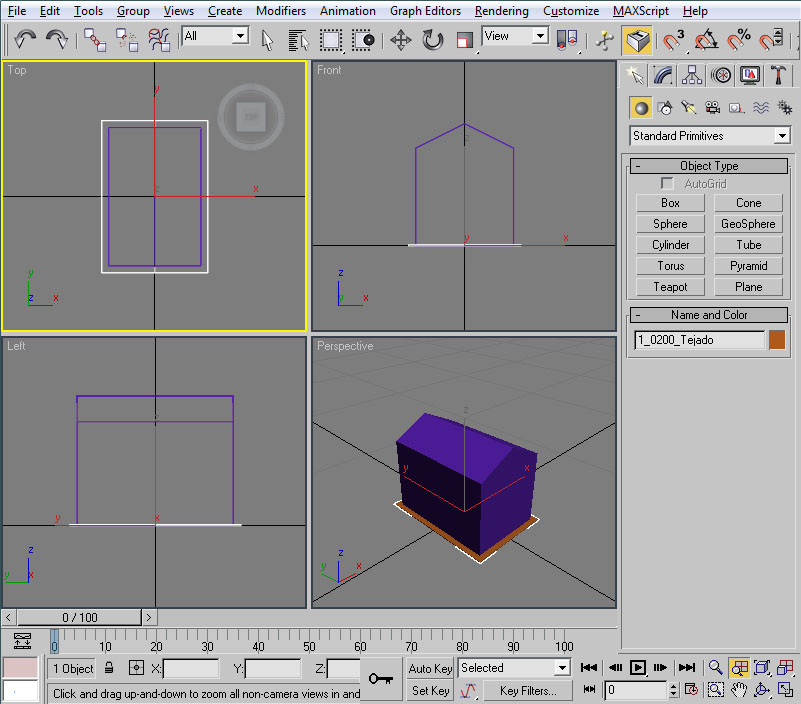 También veo que podré decidir si deseo visualizar el modelo con las superficies cerradas e iluminadas (Smooth + Highlights), o solo el armazón de aristas del modelo (Wireframe). Esto me da una cierta comodidad, pues empiezo a poder decidir en parte la manera en que trabajaré con el 3ds Max.