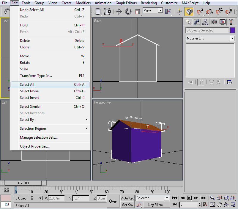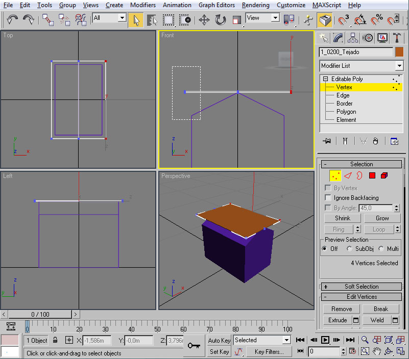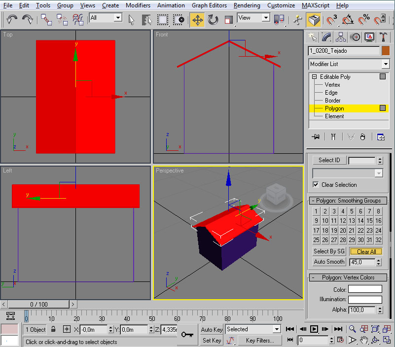 Con esto ya tenemos preparado el material para nuestra casilla, con su textura y su configuración de iluminación. Ahora la pregunta que nos surge es ¿cómo le aplico el material al modelo? En primer lugar deberemos tener seleccionado el/los elemento/s a los cuales vamos a asignar dicho material. Como en nuestro caso serán todos los objetos de la casilla nos bastará seleccionarlos con "Control" + "A". Un vez realizado esto tendremos varias maneras (como suele ser común en 3ds por lo que vamos viendo) de llevar a cabo la asignación: