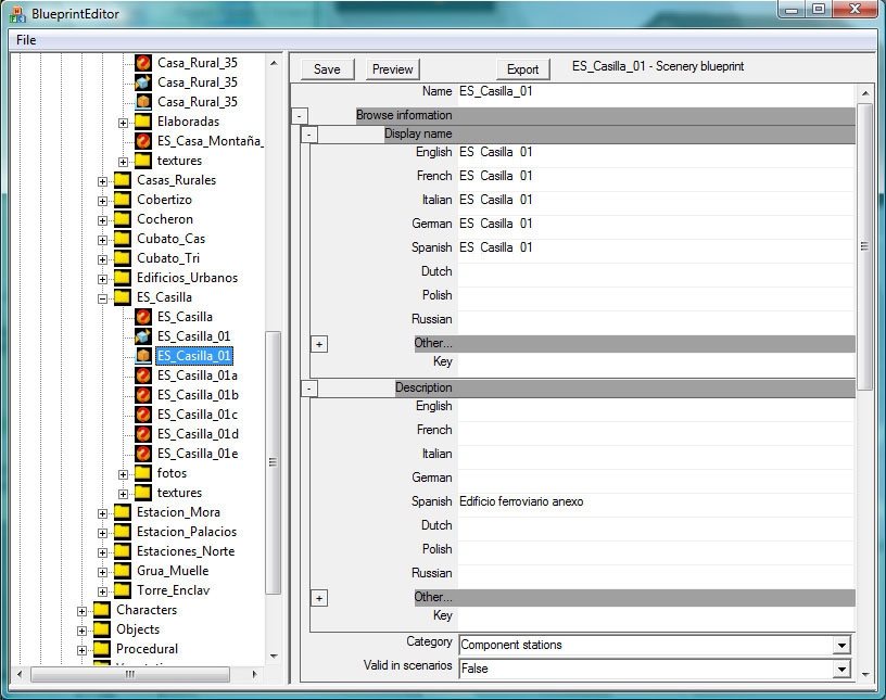 • Display Name: Aquí podemos poner el nombre que se mostrará en los diferentes idiomas en que se ejecute el juego. Pondremos "ES Casilla 01". Este es el nombre que aparecerá en el simulador para seleccionar este objeto cuando lo vayamos a colocar en una ruta. Recordamos nuevamente la propuesta de normativa para nombrar creaciones en RW.