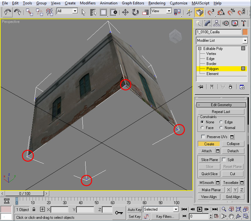 En primer lugar, como la casilla la vamos a moldear mediante operaciones booleanas para "ahuecar" ciertas partes de sus fachadas, es necesario que sea un objeto "cerrado" en su totalidad. Esto no es así porque en su momento eliminamos el polígono inferior de la casilla (como ejemplo de aligeramiento de polígonos de las piezas), por tanto, y en esta ocasión, en primer lugar deberemos volver a crear un polígono en la base de la casilla que nos "cierre" la forma geométrica de la misma.