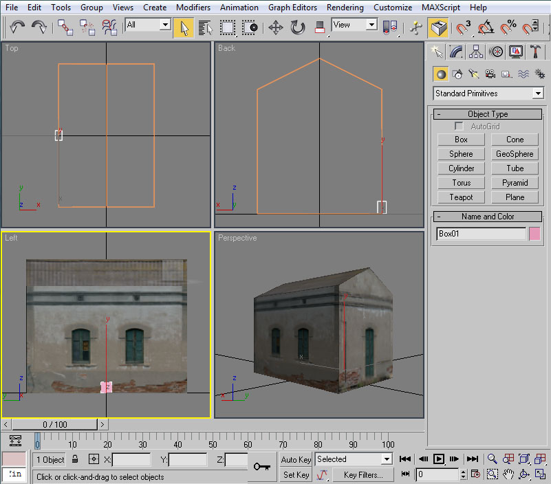Desplazaremos el cubo hasta la posición de la ventana. Esto lo podemos hacer mediante "Select and Move" y, en la vista lateral, pinchando con el ratón sobre las dos flechas, verde y roja, que aparecen sobre el "pivot" del cubo.