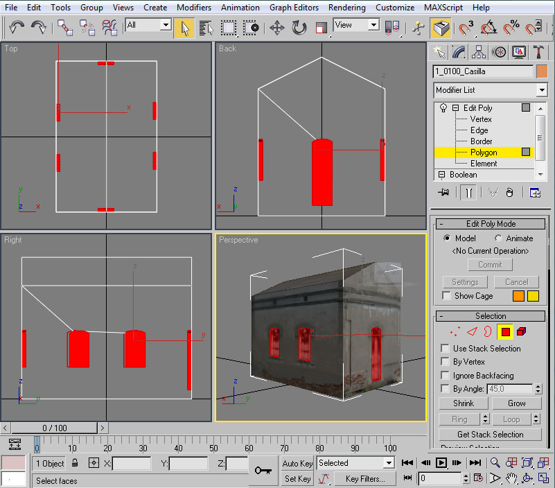 Al nuevo cuerpo de la casilla le vamos a "ahuecar" ventanas y puertas para obtener un resultado semejante a este: