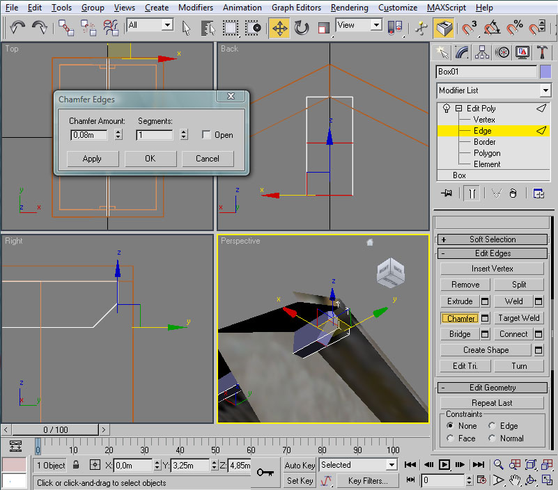 Con ambas aristas seleccionadas buscaremos el botón "Connect" en el Command Panel, bajo el apartado "Edit Edges", y pulsaremos sobre el pequeño icono que tiene adosado, para que nos solicite los parámetros de "conexión" de las aristas. Este comando crea aristas que conectan las seleccionadas. En la ventana que nos aparece informaremos que queremos 4 segmentos (nuevas aristas) y aceptaremos.