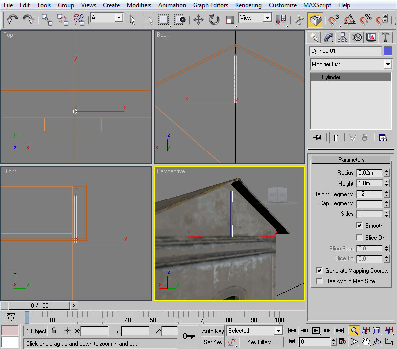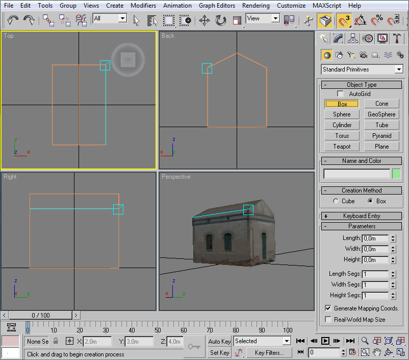 Crearemos, en la vista top, un cubo y le daremos las medidas 0,4 m. de ancho, 0,4 m. de profundidad y 0,4 m. de alto. Lo desplazaremos 2 metros hacia la fachada lateral izquierda, para que esté justo sobre ella, para lo cual bastará darle las coordenadas X=-2,0 m, Y=0,0 m y Z=0,0m.