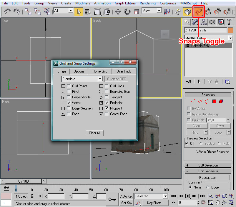 3. En el viewport pasaremos el ratón cerca de alguna de los vértices inferiores. El cursor, que mostrará una especie de mira telescópica, cambiará su forma (se hace más estrecha la mira) cuando nos situemos sobre el vértice con exactitud. En ese momento pulsaremos para indicar que este debe ser uno de los vértices que definirán el nuevo polígono a crear.