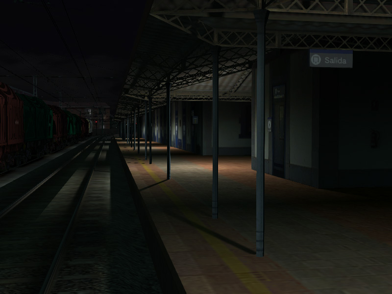 En una primera aproximación al tema he procedido a colocar unas cuantas 'farolillas' con las luces que incluye el TS2012 por defecto en el editor. A pesar de su enorme potencia y el aspecto tétrico sirvan estas capturas para mostrar el principio de lo que se podría conseguir con el nuevo motor del simulador. Habrá que investigar valores para poder hacer que esta bonita estación luzca en la noche como merece. Siento la calidad de las capturas, pero mi ordenador va muy justito y con tantas luces y tantas sombras no he conseguido moverme con soltura (1 fps cada 2 segundos es una tortura para moverse).