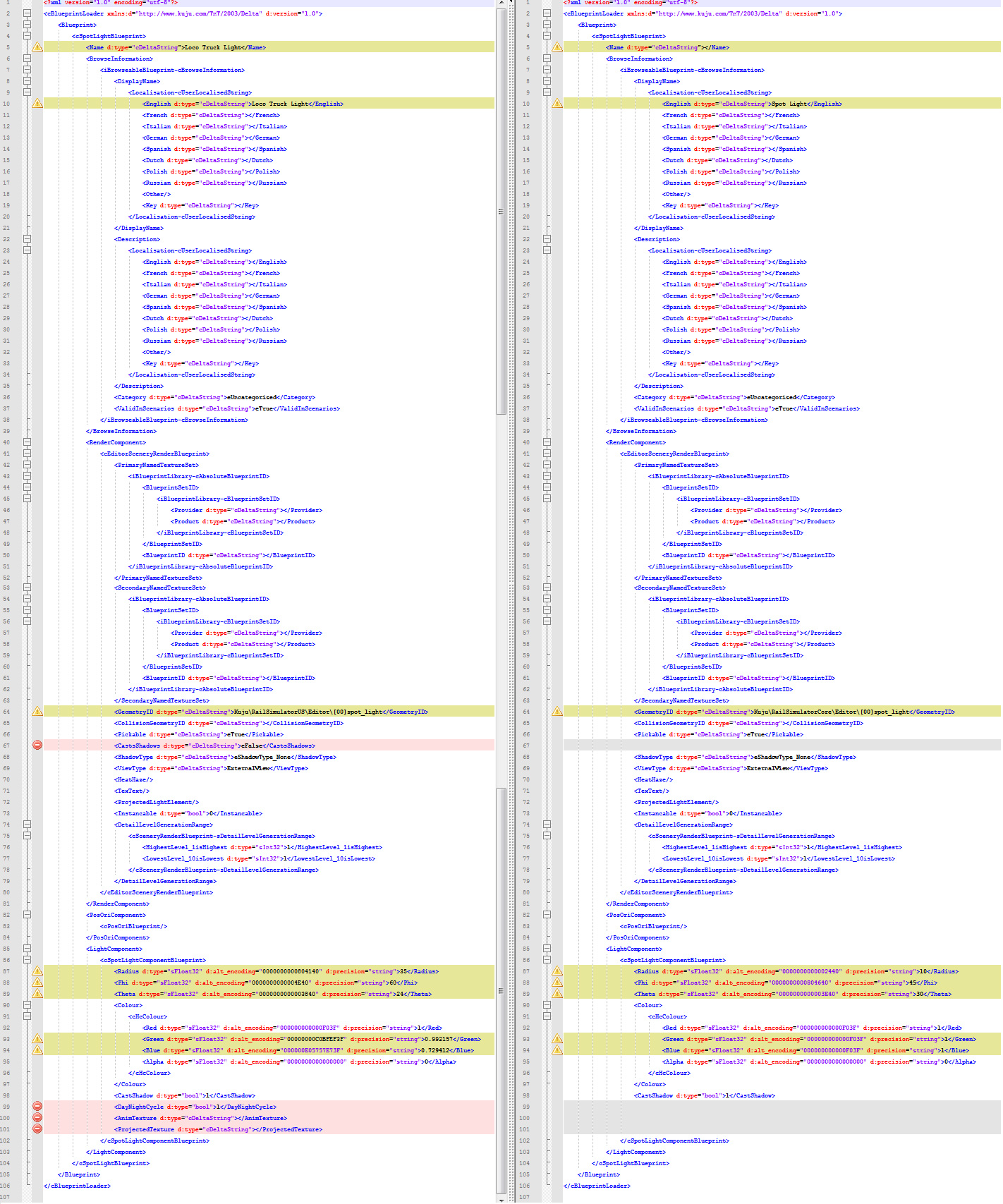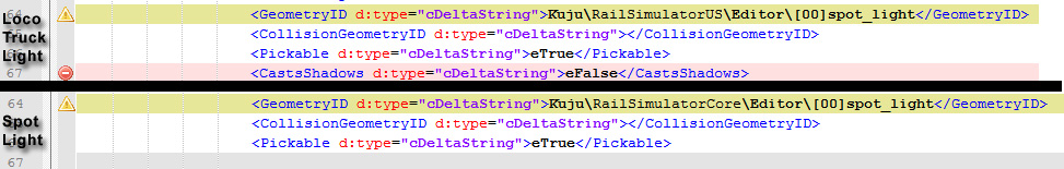 Pero en la línea 67 aparece una primera diferencia: la luz "Loco Truck Light" tiene el parámetro "Cast Shadows" (generar sombras) que la "Spot Light" no tiene.