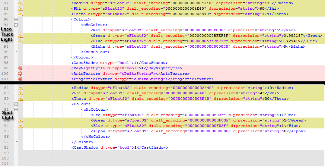 Lo que si afecta directamente es la expresión de la línea 99 en la Luz "Loco Truck Light": <DayNightCycle d:type="bool">1</DayNightCycle>. ¡Ciclo día/noche activado!