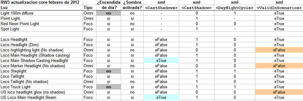 Comparativa de algunos parámetros de los ficheros xml de las luces de RW3