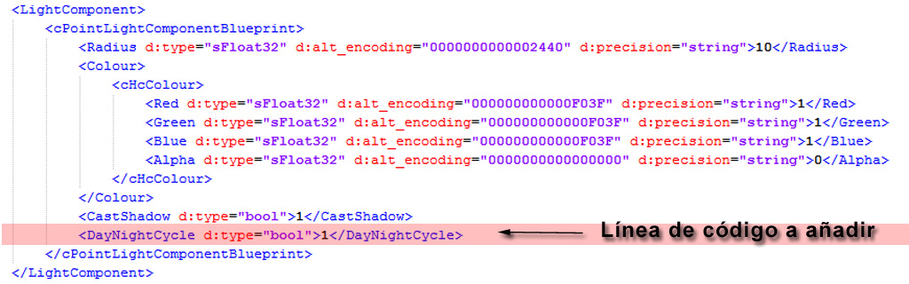 Analizando los parámetros de la luz "Light 100m dufusse" que respeta el día y la noche, y comparándolos con la luz "Point Light" que no respeta el ciclo, añadiendo una línea en el xml de la luz "Point Light" (PointLight.bin) he llegado a este equilibrio:
