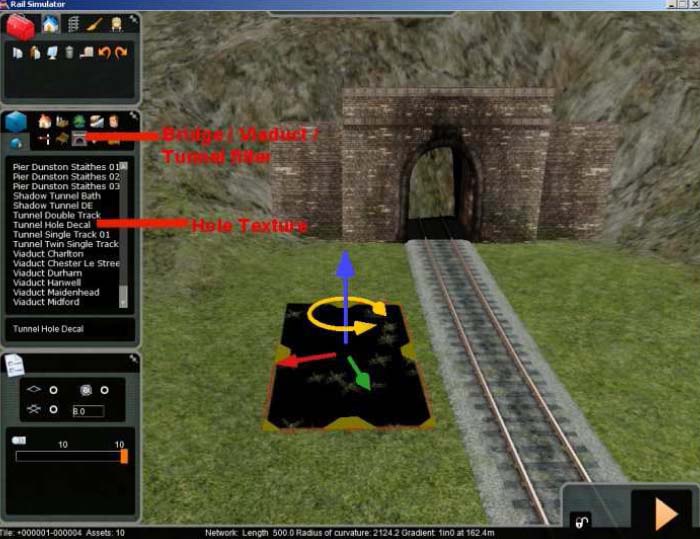 Decals are flat textures which cover the shape of the terrain. They can be resized with the corner and side handles as well as rotated. Once the decal is placed on the tunnel it will be difficult, though not impossible, to select again because the selection of the track or tunnel mouth are in close proximity. Place the decal on the ground near the tunnel and approximately resize it to the size of the inside of the tunnel shape and at a suitable orientation (also shown in the picture below). When satisfied, select it and drag it over the tunnel mouth. In editor mode it will look like a black texture but when in drive mode it will become transparent.Decals son texturas planas que cubren el terreno. Pueden variarse de tamaño desde las esquinas y laterales y también pueden rotarse. Una vez que el decal está colocado en el túnel, puede ser difícil, aunque no imposible, seleccionarlo de nuevo para ponerlo en su sitio porque la vía o la boca del túnel están muy cerca. Por eso, coloque el decal en el terreno cerca del túnel, y reescalelo al tamaño aproximado de la boca del túnel y en una orientación adecuada (como se muestra en al imagen). Cuando esté satisfecho, selecciónelo y colóquelo sobre la boca del túnel. En modo editor aparecerá como una textura negra, pero en modo conducción será transparente.