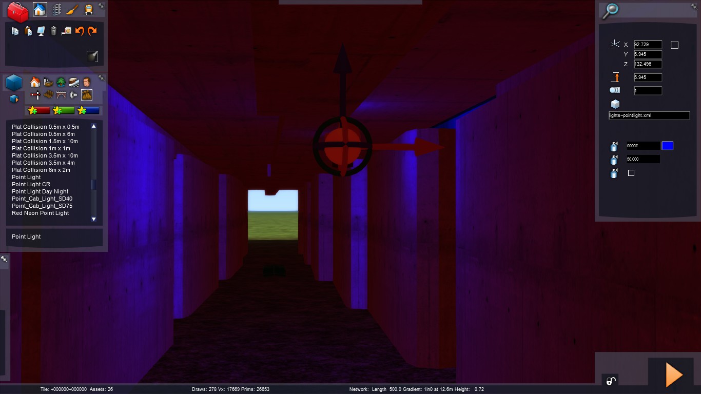 Haciendo pruebas con el volumen excluyente de túnel, me he fijado que al pinchar con doble click en la flecha que indica la dirección del objeto se abre una ventana de propiedades. En esta ventana se puede elegir el color que queremos hacer como excluyente. Para un túnel es evidente que el negro es el mejor, pero para debajo de un puente largo, quedaría mejor un color gris oscuro. Es más, se pueden poner todo tipo de colores en el volumen para filtrar la luz, pudiendose hacer hasta vidrieras. Aunque, por supuesto, esto no es 'Cathedral Simulator', aunque se pueden hacer unos efectos verdaderamente sorprendentes que tienen múltiples aplicaciones.