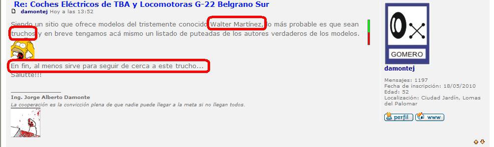 Gente quiero hacer una Aclaracion: En el foro de el sitio web Argensim, uno de los moderadores y creadores de esa pagina, Jorge.A Damonte(Damontej) hizo una acusacion falsa y muy fea de mi, un usuario creo un post mencionando nuestro sitio y la publicacion de una G22 del Belgrano Sur y Mis coches electricos toshiba, y ese Señor en palabras claras me agredio verbalmente diciendo que soy un trucho... y que el toshibas publicados no eran de mi auditoria o que yo no soy el creador... todos sabes que a partir de las capturas que yo publique a lo largo de el año 2010/2011 fui mostrando como se iva desarrollando.. Les pido una cosa, hagan justicia¡ respondan el post abierto en argensim y desmuestrenle a ese Tipo la verdad...