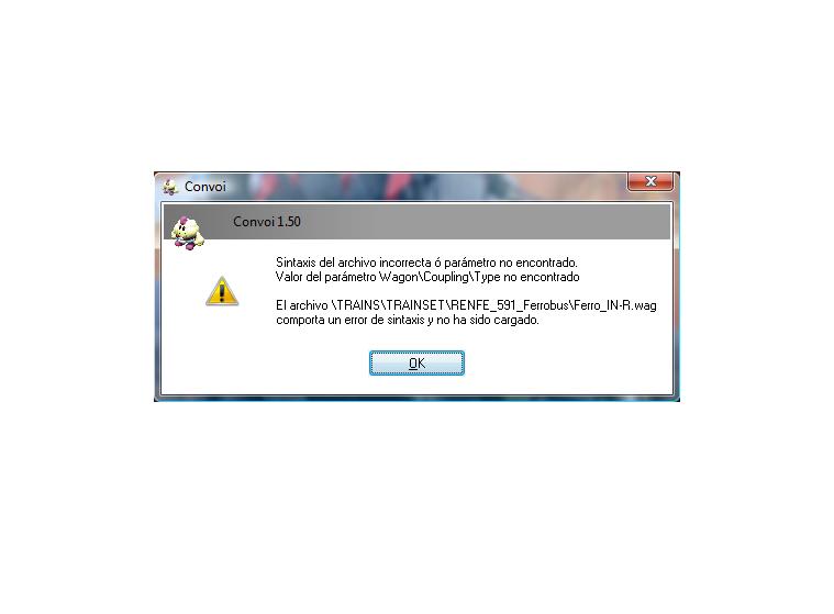El segundo tren o sea regional 591 ferrobus v.2, el archivo wag que falla, es el de uno de los vagones. No puedo concretarte cual, pues estoy en centro publico y hasta que no vaya a mi casa no lo podria ver. El ferrobus consta de 5 o 6 archivos con y dentro de carpeta TRAINSET hay varios archivos wag de diferentes vagones del mismo. El wag que falla, esta en TRAINSET, pero juego no lo detecta. Al inicial el train simulator me sale el mensaje de error, nombre del archivo.wag no se encuentra o parecido.