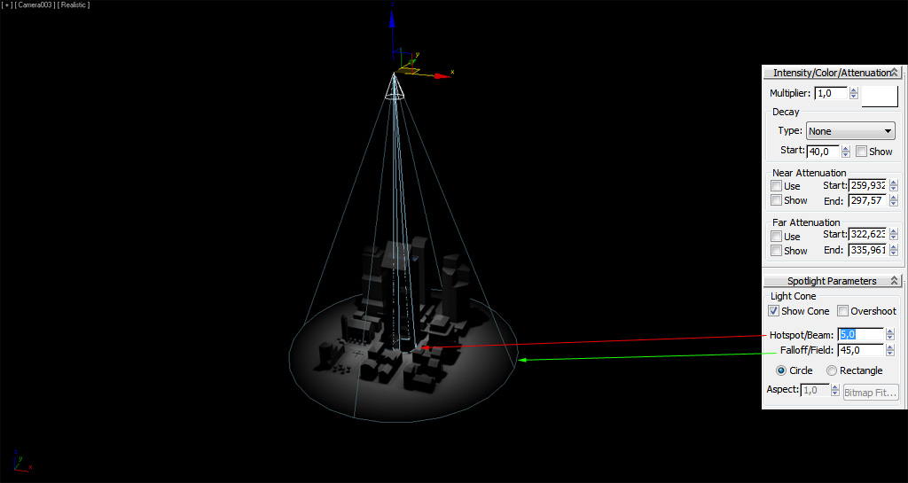 Dentro del cono interior (Inner cone), con el ángulo definido en "Hotspot/Beam" o "Theta" en Directx y RW3, la luz impacta con la máxima intensidad en la zona del círculo interior. La intensidad de la luz va decreciendo hasta llegar a 0 en el espacio delimitado por el cono exterior (Outer cone) según su ángulo definido por "Fallof/Field" o "Phi" en Directx y RW3, delimitando por el cículo exterior la zona a partir de la cual no hay luz.