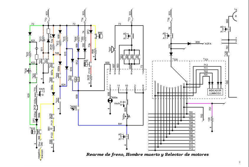 − Secuencia de pedal no pisado: • A los 2,5 s de estar libre el pedal se enciende una luz azul de aviso en el pupitre. • Si no se hace nada 2,5 s después suena un aviso acústico. • Si no se hace nada 2,5 s después se abre el lazo de freno provocando el frenado de emergencia.
