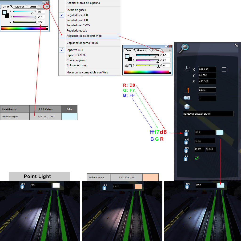 Proceso y ejemplos de conversión de color RGB a valores para luces en RW3