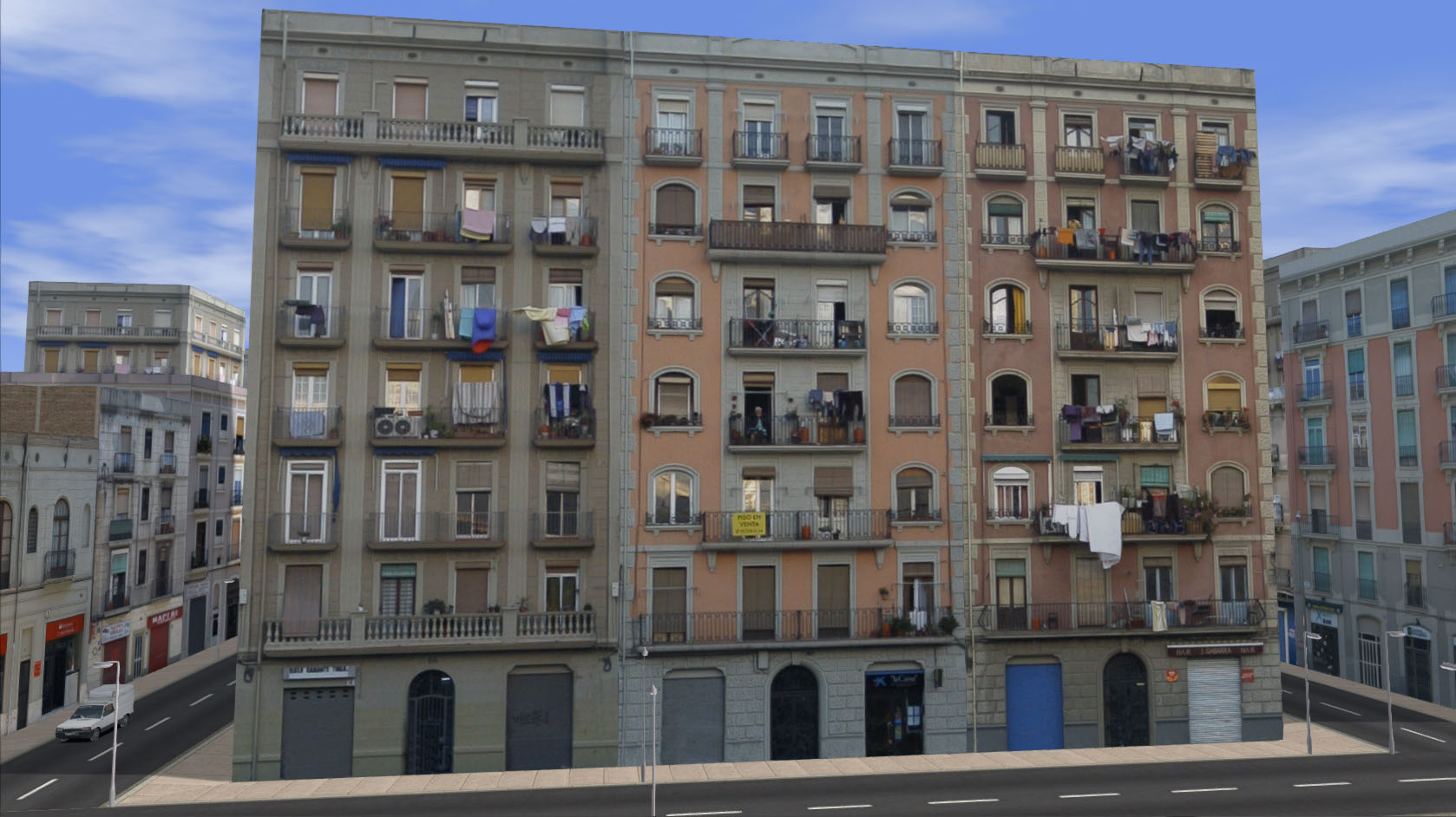 Un par de bloques más de edificios suburbanos, en este caso parte de los inquilinos han sido desalojados y se teme un pronto derribo de los mismos, aunque un vecino resiste al mobbing de las constructoras (el edificio central del bloque derecho con la planta baja azul), protestando por los ataques recibidos con pintadas y pancartas.