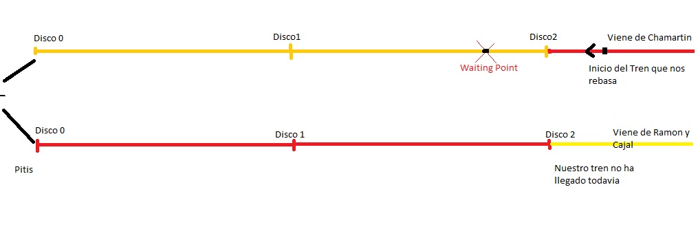 Nuestro convoy viene de "Ramón y Cajal" Y necesitamos que el nuestro "Disco 0" este cerrado cuando lleguemos y abierto para el tren que "Viene de Chamartín". Tenemos que tener en cuenta que nuestra vía tiene prioridad. Y la solución es esta :